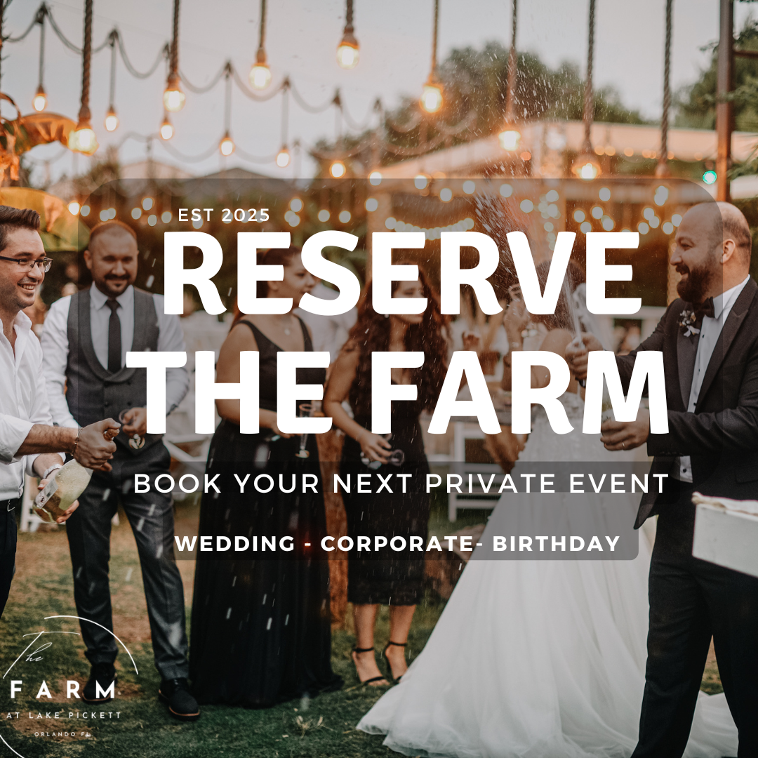 The Farm at Lake Pickett spans 57 acres of pristine farmland and extraordinary event spaces. Grounded in sustainable farming, we provide fresh harvests for our community while welcoming guests to seasonal festivals, upscale weddings, and private gatherings. From our 110-foot event barn with climate-controlled bridal suites to a stunning five-acre live oak forest that creates shaded markets and unforgettable photo backdrops, every detail of our farm is designed to celebrate nature, community, and lasting memories.